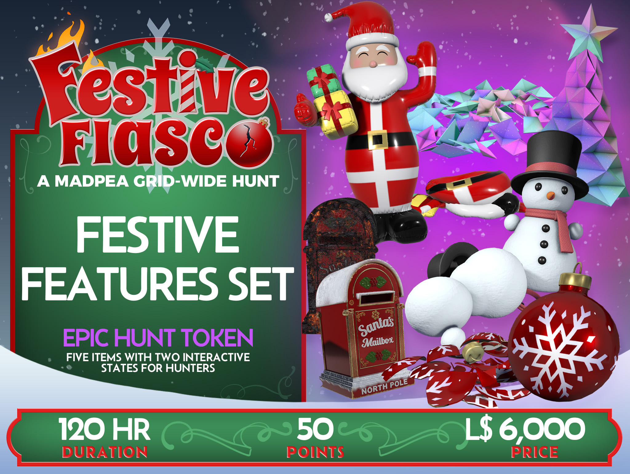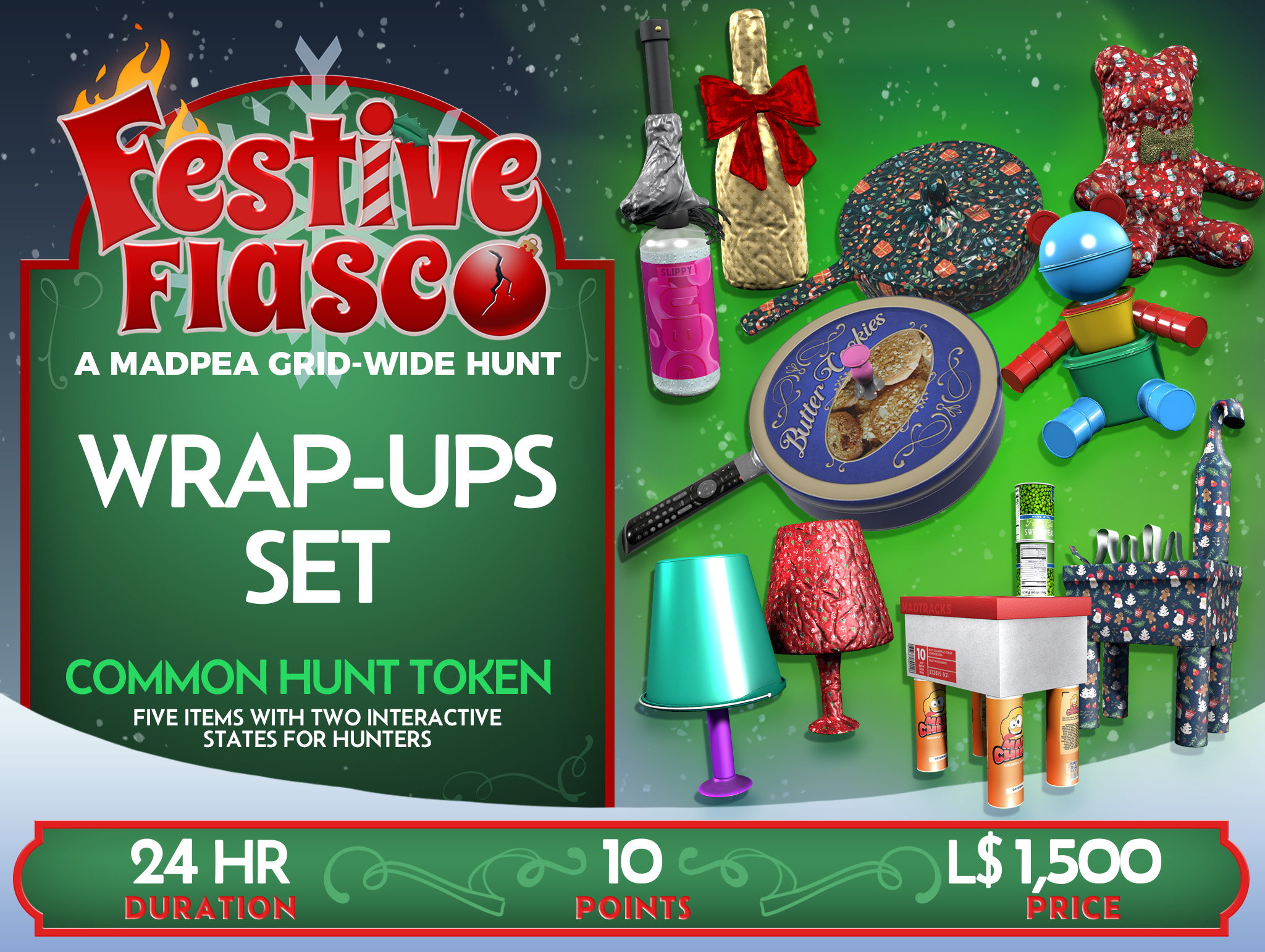 Purchase your Festive Fiasco Hunt items, either individually or by the bundle, hide them, and watch as hunters come running!