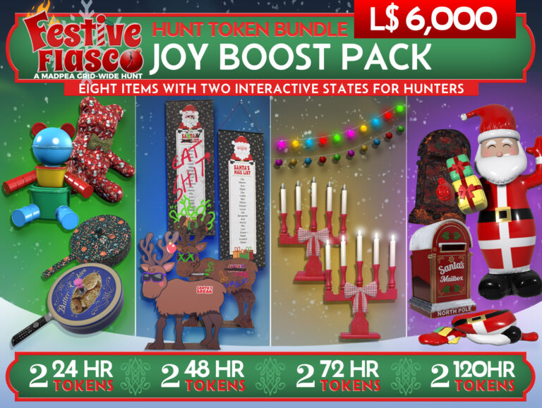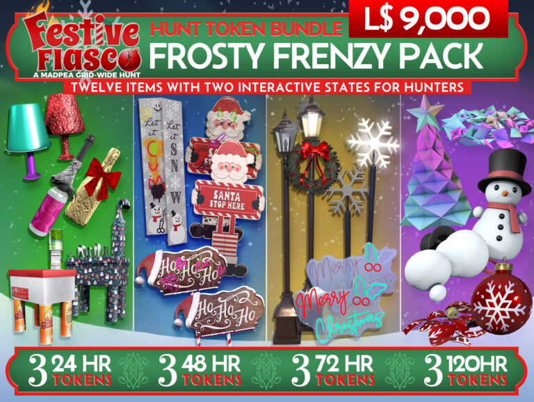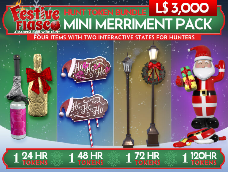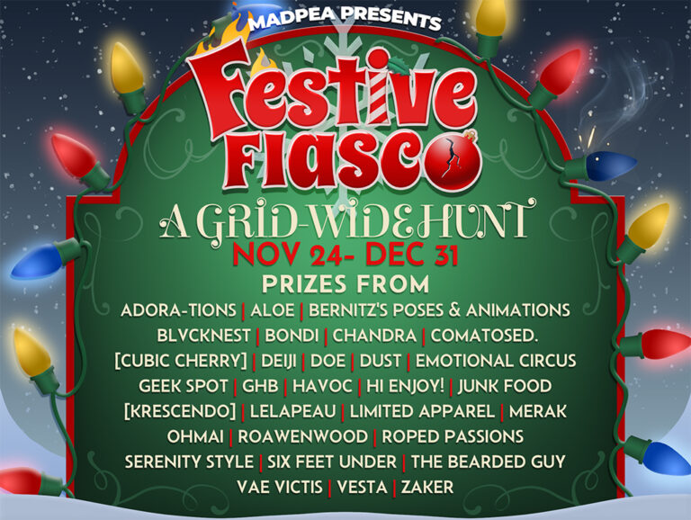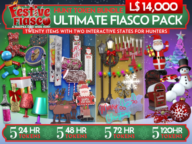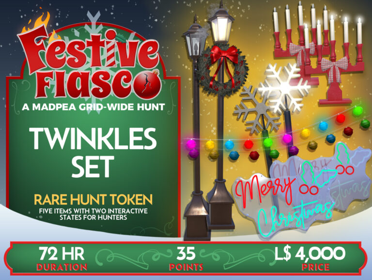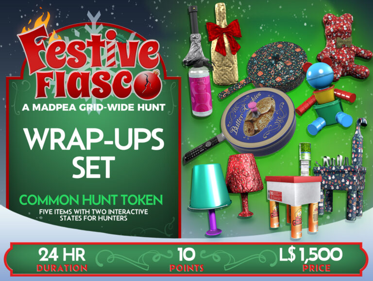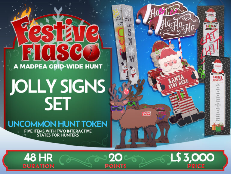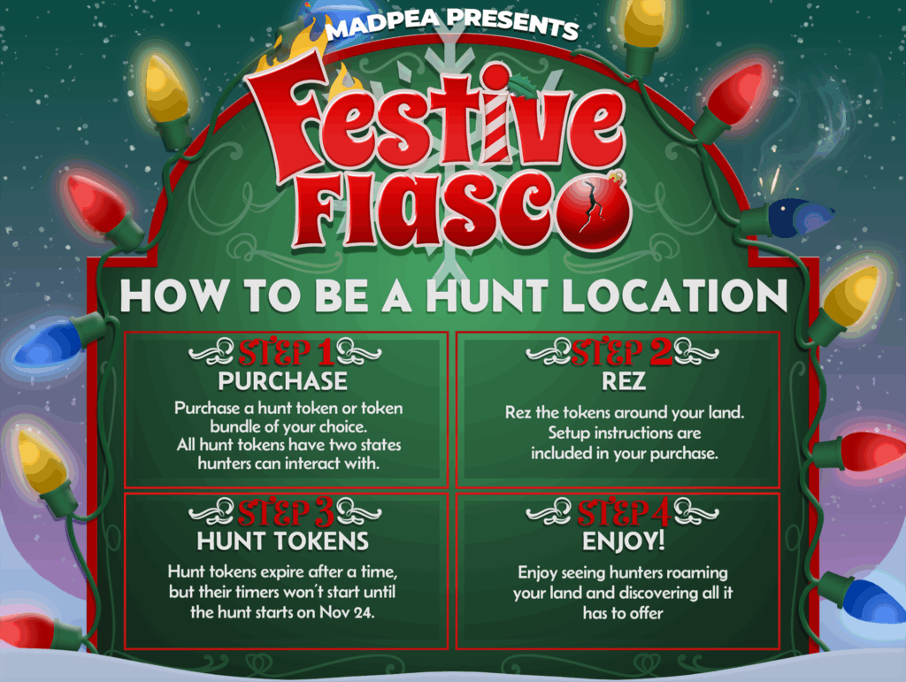 If you own a parcel, region, store, or club and are willing to allow public access, all you need to do is go to the Festive Fiasco Hunt Start, MadPea Mainstore, or visit MadPea on the Marketplace.