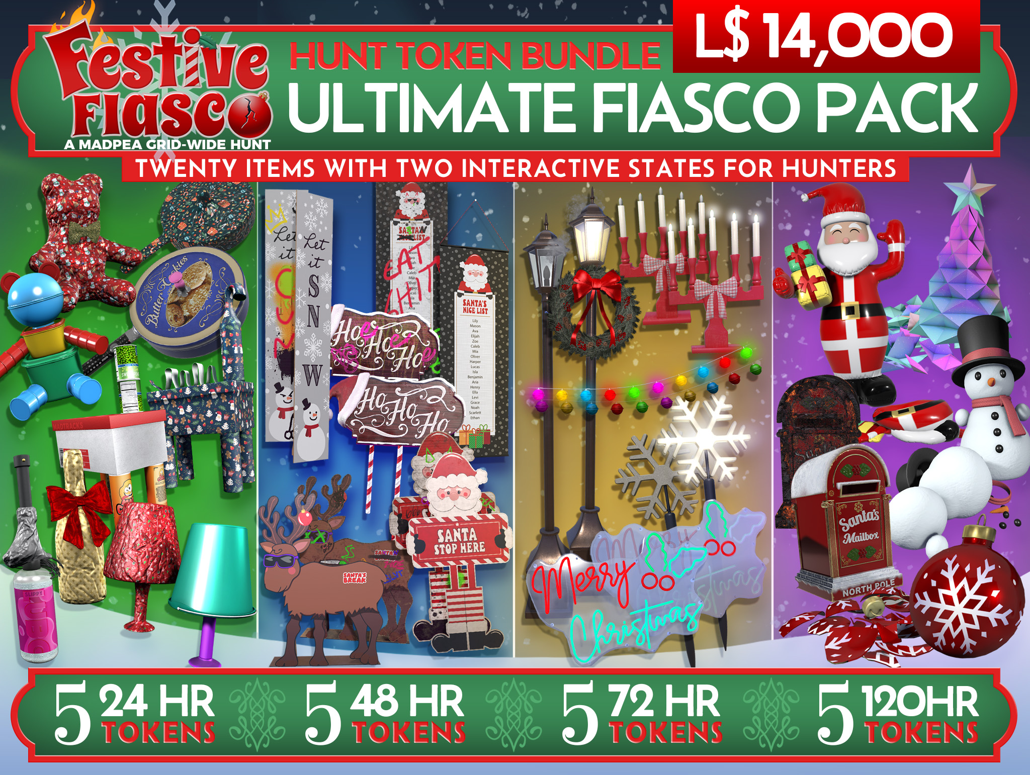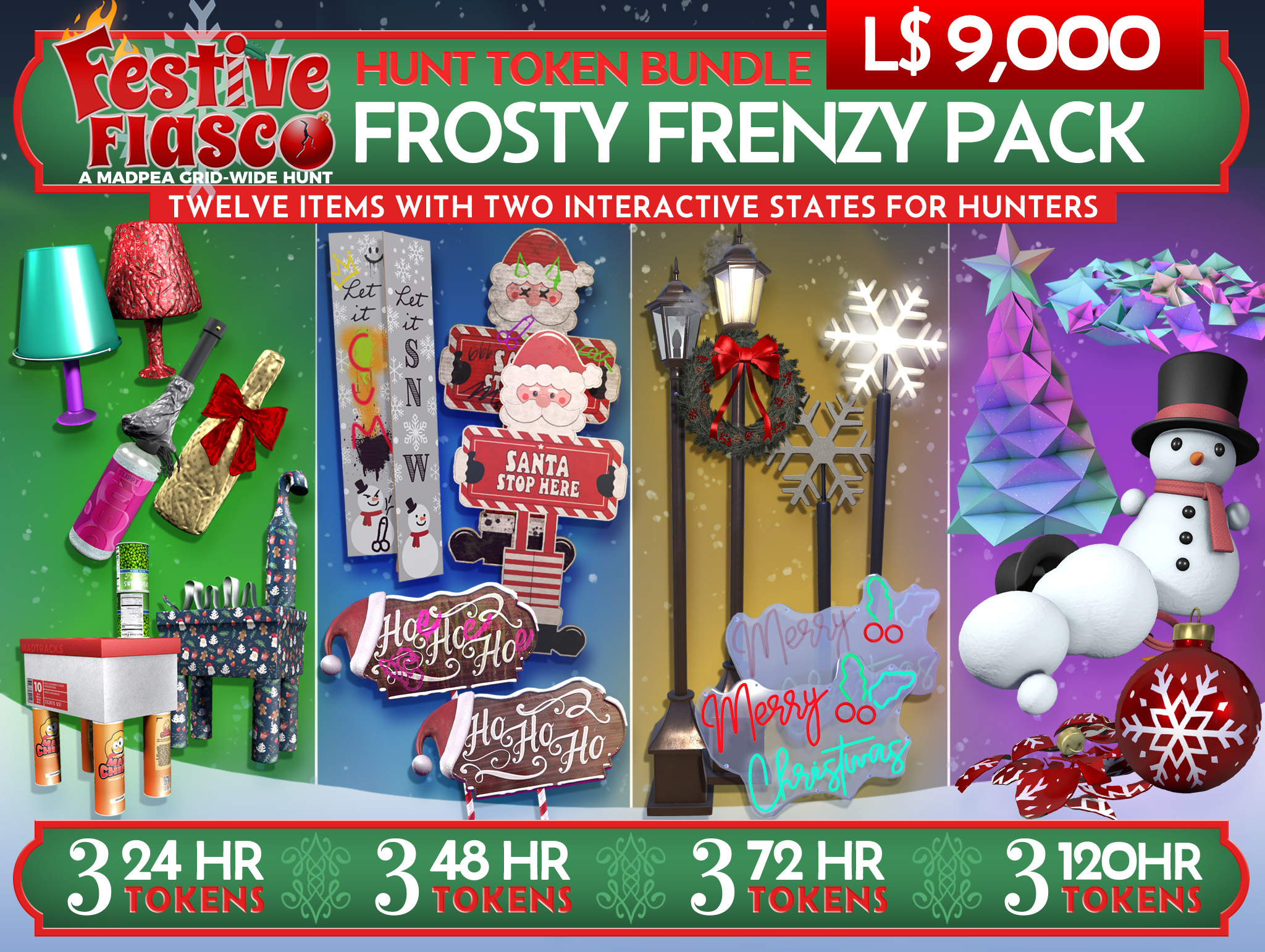 The Festive Fiasco Hunt brings tokens to life with two unique interactive states, giving Hunters double the excitement at every turn!