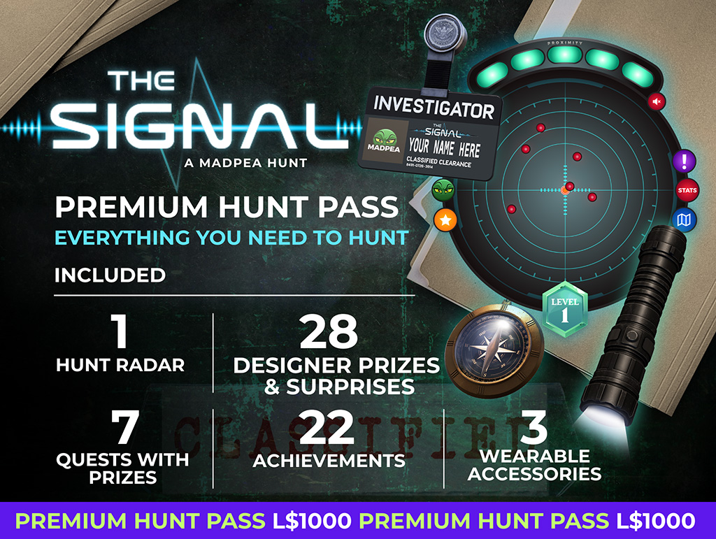 The MadPea button gives you access to settings, support, MadPea’s social links, and the SLURL to the hunt headquarters!