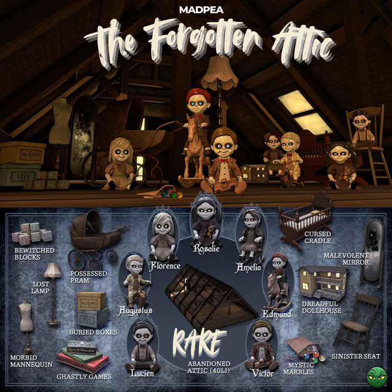 Discover eerie porcelain dolls with haunting voices, an Abandoned Attic skybox that’s draped in dust and mystery, a Cursed Cradle, a Possessed Pram, plus many more forgotten treasures.