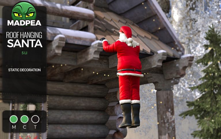 Oh no! Keep an eye out for MadPea’s Roof Hanging Santa as he hangs on for dear life! This item is a static decoration only and only 5 Li.