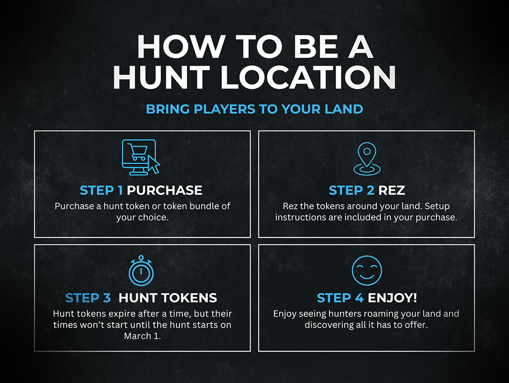 • Please ensure the parcel where you hide your hunt object is set to public access or people will not be able to enter to find the hidden hunt objects.