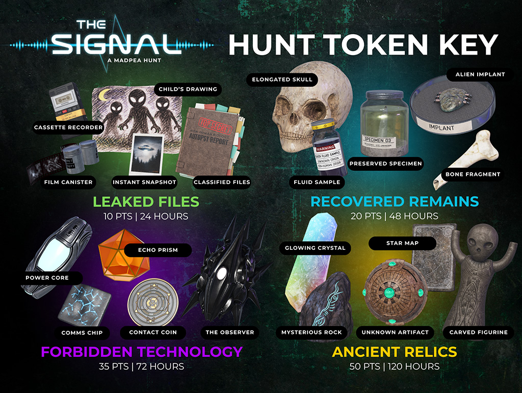 The Signal Hunt tokens awaken a cosmic conundrum to life, enticing hunters to track them to your location!